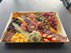 Pique your visual and tastebud interests with our Thanksgiving Large Charcuterie & Cheese Board! Our unique offering includes 5 delectable cheeses, featuring our signature pumpkin butter chèvre in the shape of adorable pumpkins. You'll also enjoy 3 flavorful charcuterie meats, as well as an array of accompaniments such as fresh and dried fruit, veggies, nuts, olives, jams and honey, and tangy cornichons. Plus, we're adding special holiday elements for a festive touch!